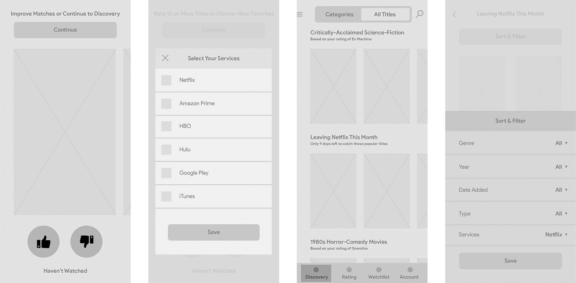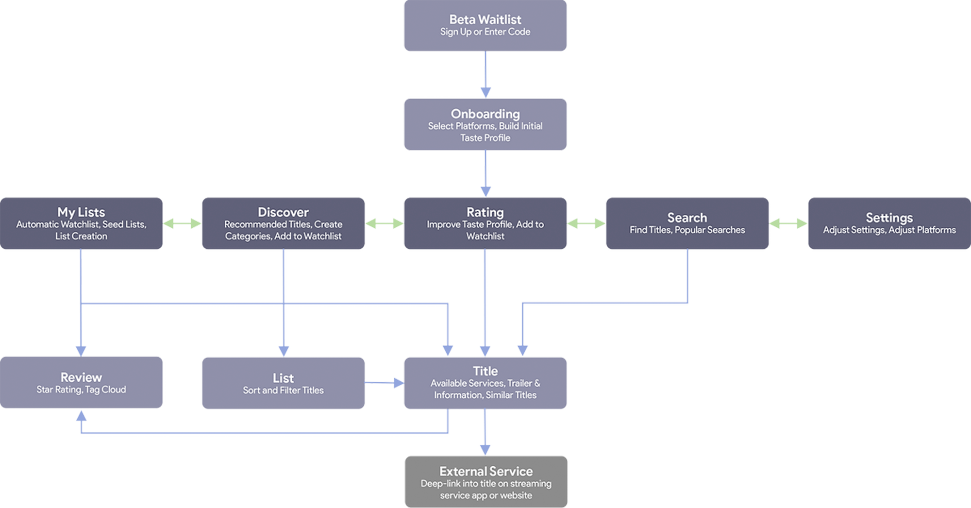 Based on the user personas, research into competitors and other adjacent discovery platforms, conversations with the founders about product goals, and conversations with the CTO about the planned backend, I created a user flow and high-level information architecture plan for the product. We would begin with a waitlist in order to build up a significant user base for our alpha and eventual beta launch. After users sign up for the the waitlist and receive their access code, they would go through the onboarding process where they would select their streaming platforms and build their taste profile. Once we had enough information to serve recommendations, the user would be given access to the full app, including rating, list building, discovery, and search. The goal would be to drive them to add titles to their waitlist in order to get them to a title of their choice, then deep-link them directly into that service.