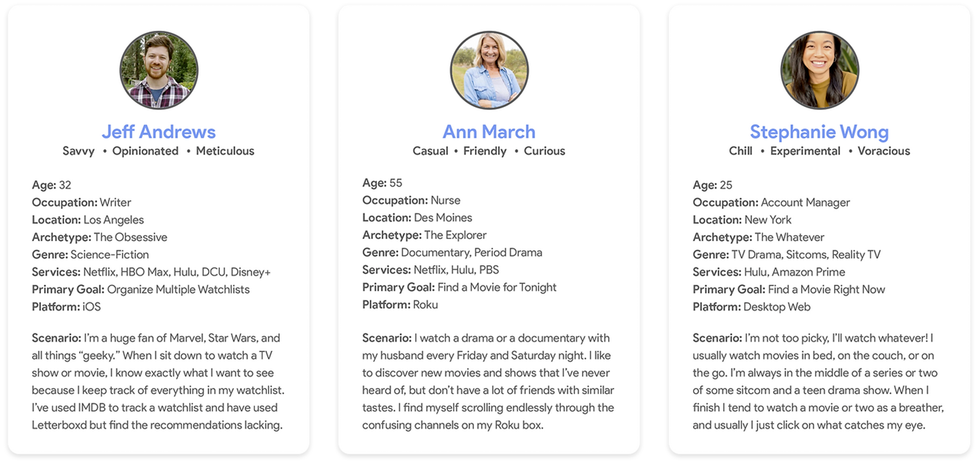 Based on the demographic breakdowns of major streaming providers from industry sources as well as research into the user bases of similar and adjacent services, I crafted three user personas for VUniverse: The Obsessive, representing the 18-35 male demographic who would was less interested in discovery than creating lists and categorizing titles and would be our early-adopter user set, The Explorer, representing the 45-65+ demographic of casual users who were focused on getting specific recommendations to their tastes, and The Whatever, a demographic of young, voracious viewers who wanted lots of recommendations for lots of genres. These personas helped to drive decisions about which features to focus on for the beta launch and beyond to create eager product advocates who would use the service while we were still in our nascent stages and adding features.