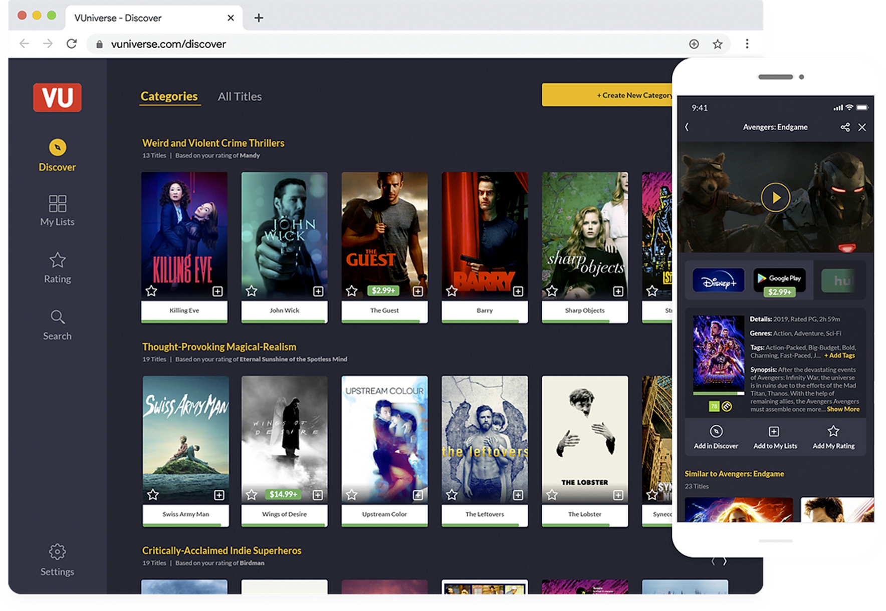 VUniverse was powered by an AI-based learning algorithm built on top of a complex web of nodes from information provided by our data providers. This algorithm would serve smart, granular lists of movies and TV shows which corresponded to a user's taste profile—specifically recommending titles which they gave a high rating to, either during onboarding or during browsing. Going well beyond the high-level list of genres provided by the streaming services themselves, these lists would be able to account for mood, critical rating, subgenre, and even thematic connections between films. The algorithm would get smarter over time using information provided by our users, from their taste profiles to the lists that they created to "reviews" in the form of pre-written tags from a word cloud. Each time a user-generated list was created and matched the taste profile of another user, that list would also be floated to the top of similar users profiles, then customized by sorting the list based on previously watched titles, differences in taste profiles, and selected streaming services. In addition, lists were generated for titles which were arriving on or leaving streaming services every month, ensuring that users had new content every time they came back as our algorithm deepened its understanding of movie and TV connections.